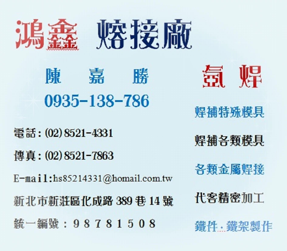 鴻鑫熔接廠 服務項目 : 氬焊 補模 各種金屬焊接 代客加工 排氣管焊接 氬焊修補模具 焊補特殊模具 焊補